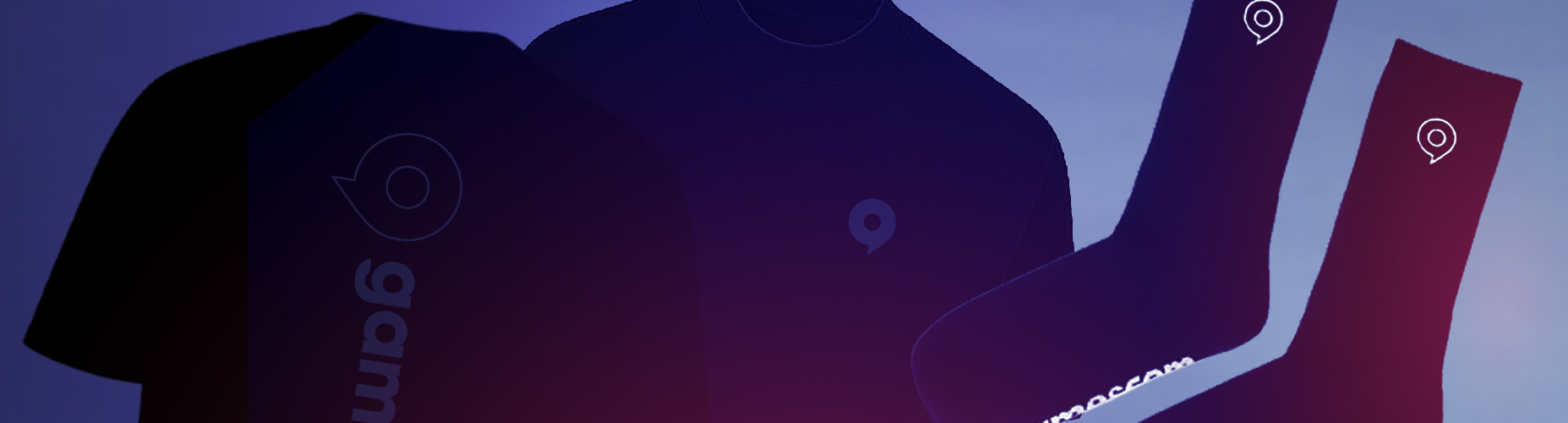 zwei Personen stehen mit den aktuellen VIBES26 T-Shirts vor einem Gaming Hintergrund